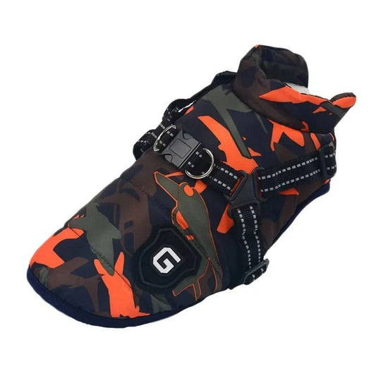 Orange Camouflage Winter Pet Dog Jacket With Harness Warm Clothes Waterproof Coat Outfits