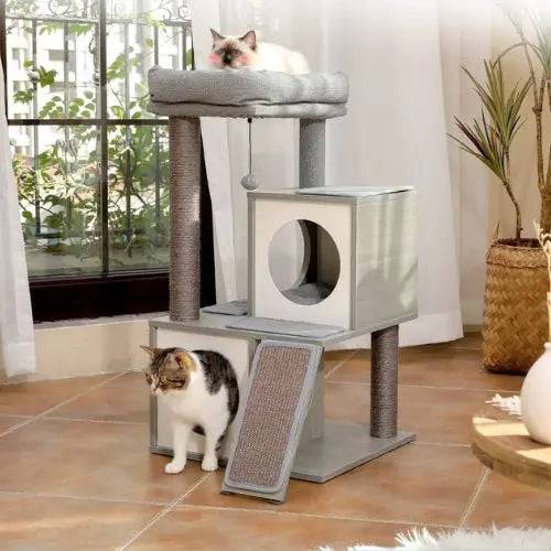 34" Wooden Grey Cat Tower with Double Condos, Spacious Perch, Fully Wrapped Scratching Sisal Posts and Replaceable Dangling Balls
