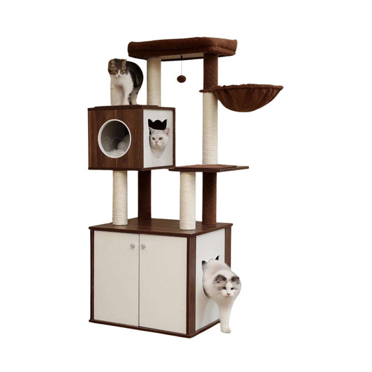 59" Brown Luxury Cat Tree Tower with Cabinet Wood Post Toy Large Spacious Perch Sleep Hammock