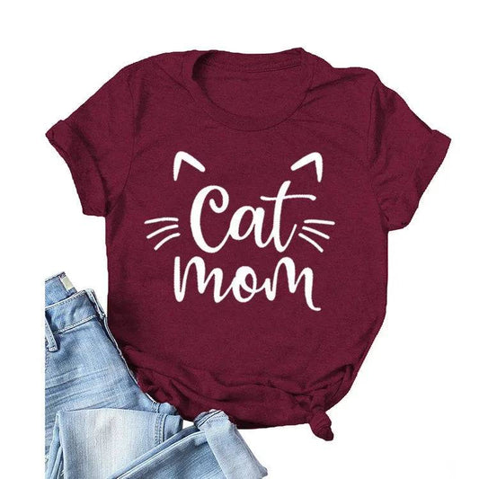 Burgundy "Cat Mom" Vivid Letter Print Women T-Shirt Short Sleeve O-Neck Loose Ladies Tee Tops Clothes