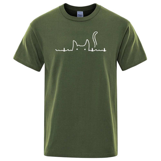 Dark Green Casual Men's T-Shirts Cat Cute Printed Summer Cotton O-Neck Short Sleeve Top Tee T-shirts