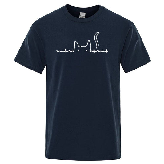 Dark Blue Casual Men's T-Shirts Cat Cute Printed Summer Cotton O-Neck Short Sleeve Top Tee T-shirts