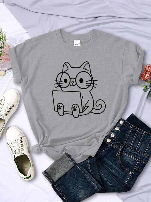 Gray Careful Study Of Work Cat Sketches Women T-Shirt Personality Trend Casual Tee Clothing Street Creative Tops Female Short Sleeve