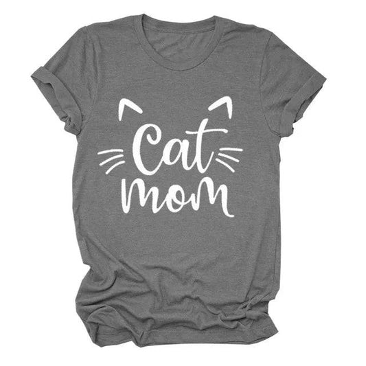 Dark Grey "Cat Mom" Vivid Letter Print Women T-Shirt Short Sleeve O-Neck Loose Ladies Tee Tops Clothes