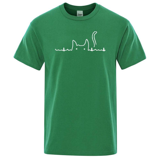 Green Casual Men's T-Shirts Cat Cute Printed Summer Cotton O-Neck Short Sleeve Top Tee T-shirts