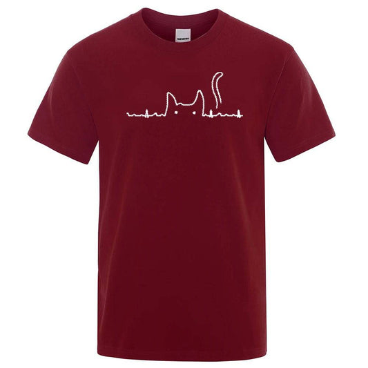 Wine Red Casual Men's T-Shirts Cat Cute Printed Summer Cotton O-Neck Short Sleeve Top Tee T-shirts