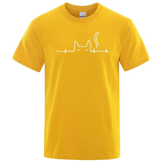 Yellow Casual Men's T-Shirts Cat Cute Printed Summer Cotton O-Neck Short Sleeve Top Tee T-shirts