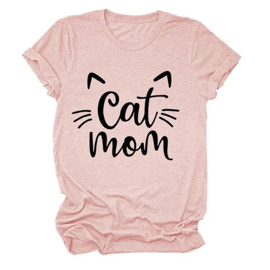 Pink "Cat Mom" Vivid Letter Print Women T-Shirt Short Sleeve O-Neck Loose Ladies Tee Tops Clothes