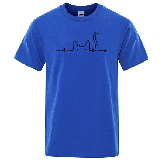 Blue Casual Men's T-Shirts Cat Cute Printed Summer Cotton O-Neck Short Sleeve Top Tee T-shirts