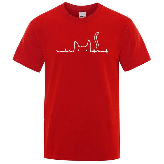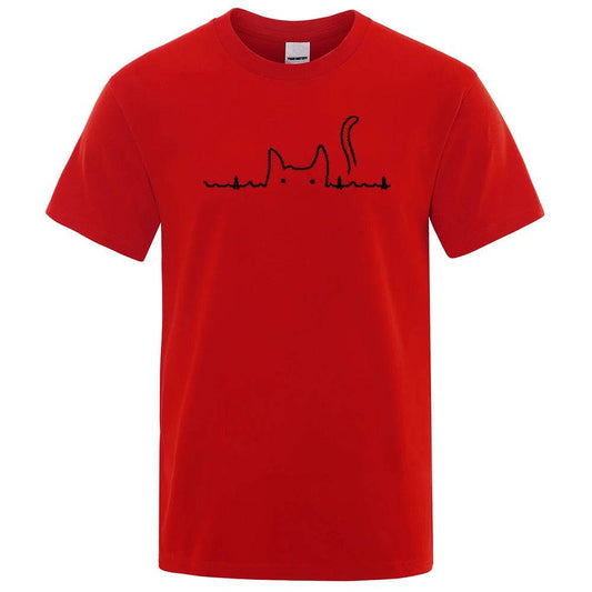 Red Casual Men's T-Shirts Cat Cute Printed Summer Cotton O-Neck Short Sleeve Top Tee T-shirts