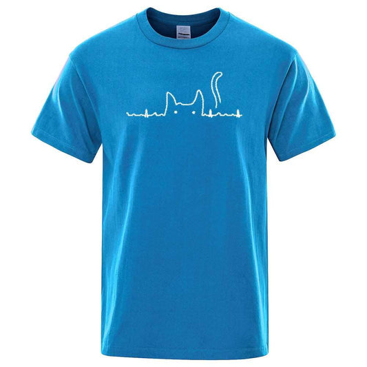 Cyan Casual Men's T-Shirts Cat Cute Printed Summer Cotton O-Neck Short Sleeve Top Tee T-shirts
