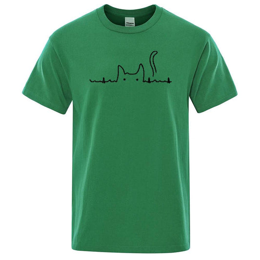 Green Casual Men's T-Shirts Cat Cute Printed Summer Cotton O-Neck Short Sleeve Top Tee T-shirts