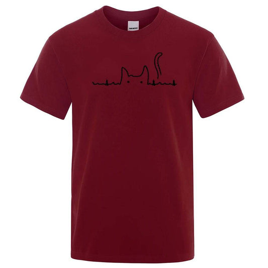 Wine Red Casual Men's T-Shirts Cat Cute Printed Summer Cotton O-Neck Short Sleeve Top Tee T-shirts
