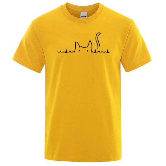 Yellow Casual Men's T-Shirts Cat Cute Printed Summer Cotton O-Neck Short Sleeve Top Tee T-shirts