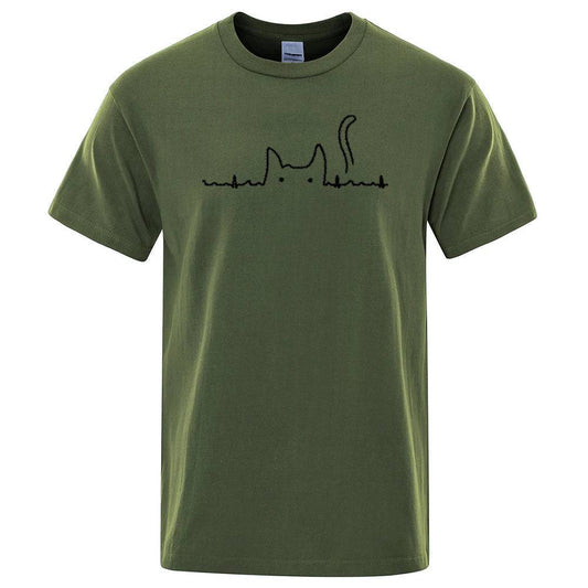 Dark Green Casual Men's T-Shirts Cat Cute Printed Summer Cotton O-Neck Short Sleeve Top Tee T-shirts