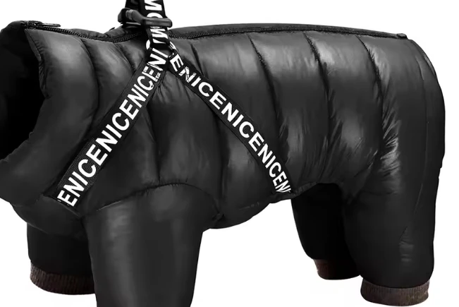 The creative design includes a back zipper for easy on and off and a harness belt for added control. The four-legged jumpsuit style ensures your dog stays warm from head to toe. The adjustable extended collar design prevents cold wind from getting inside the Super Warm Waterproof Dog Coat with Harness.