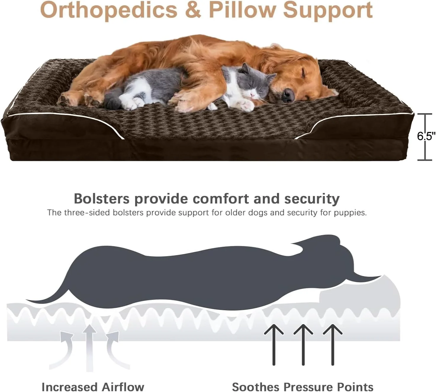 Brown Bolster Dog Bed with Waterproof Lining & Non-Skid Bottom, Washable, Orthopedic Egg Foam Couch