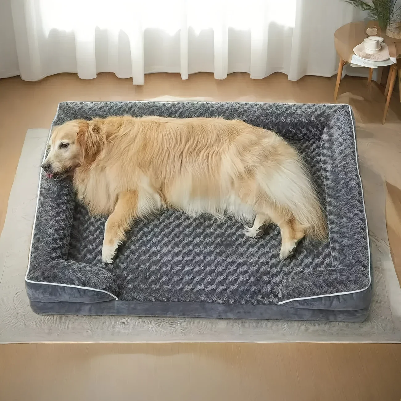 SOFA-STYLE BED DESIGN for dogs, featuring a C-shaped design and a 3-sided 5.2" side bolster for extra support and a sense of security. This extra large dog bed is perfect for ALL dogs weighing less than 80lbs, but for those who like to roll around, sizing up will provide even more comfort.