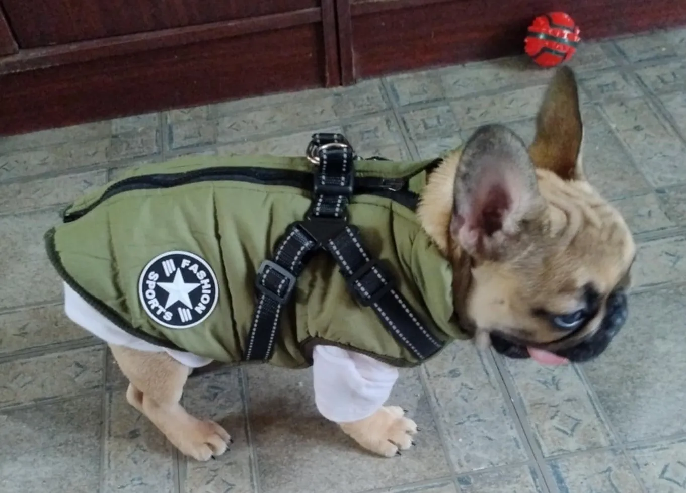 The vest is perfect for a 3-month-old, 4kg French bulldog in size L.