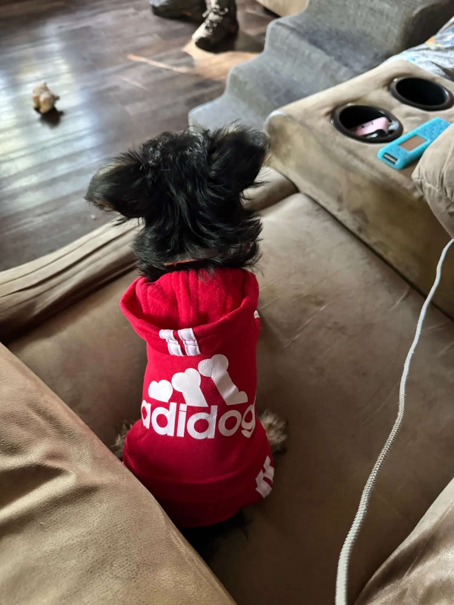 for a 5kg Yorkshire Terrier. He runs in it as if it's normal, but his tail sticks up a bit badly......