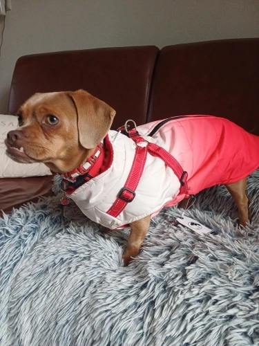 Very cool jacket for my little dog, since she is quite long (Teckel mix), it was sometimes difficult to find a suitable jacket. This jacket is a bit loose but she needed the length, but it has elastic at the chest area, making it always fit well and not too tight. Also, the harness is tightened as tight as possible, and there are still stoppers on the neck so that wind cannot get in there. my dog āāstays nice and warm. Moreover, the jacket is very beautiful and delivered quickly; definitely a recommendation! !