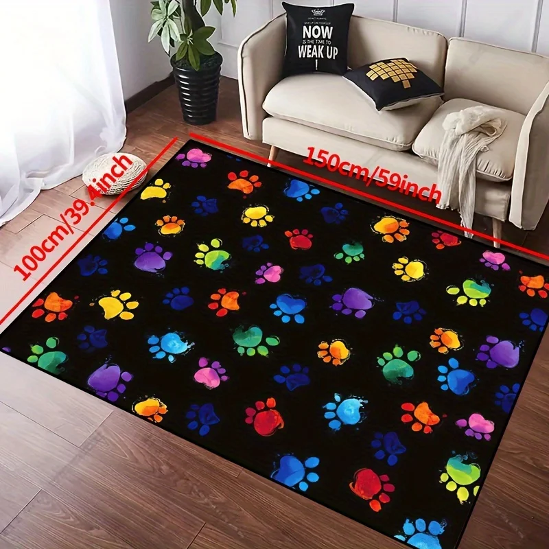 Add a fashionable touch to your living room, dining room, or bedroom with this vibrant dog paw print area rug. Featuring a bold rainbow paw print design, classic color contrast, and a practical size, this rug enhances any décor — from modern minimalist to playful pet-friendly spaces.